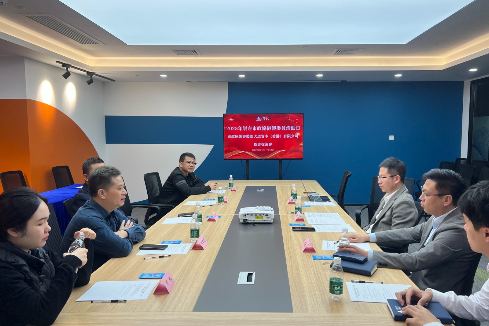 为深入学习贯彻党的二十届四中全会精神,全面落实习近平总书记关于广西工作的重要指示要求,充分发挥港澳委员的双重积极作用,2025年11月,崇左市政协秘书长黄信佩率队赴粤港澳大湾区,开展“港澳委员活动日”。作为此次活动的重要一环,代表团专程莅临大道资本(香港)有限公司调研指导,围绕深化政企合作、赋能跨境金融等议题与我司管理团队进行了深入交流。